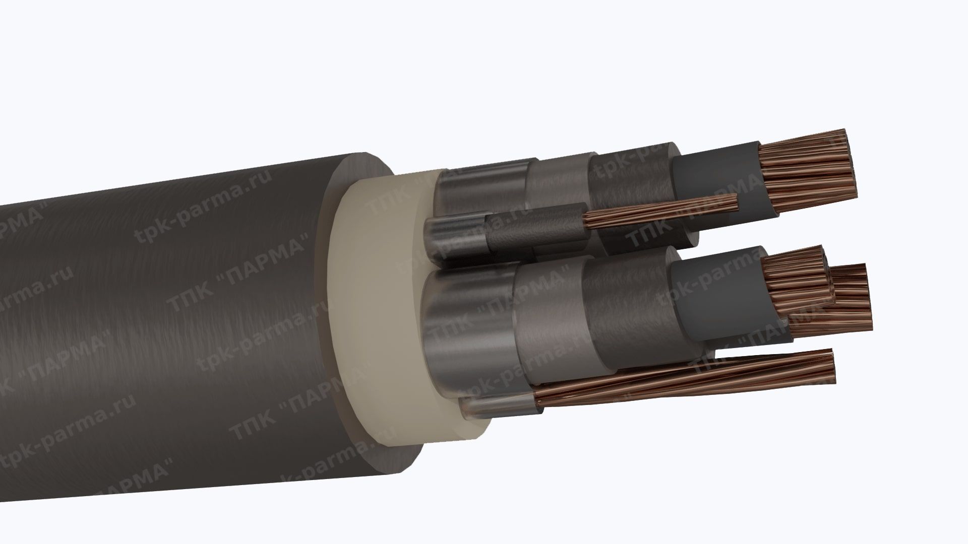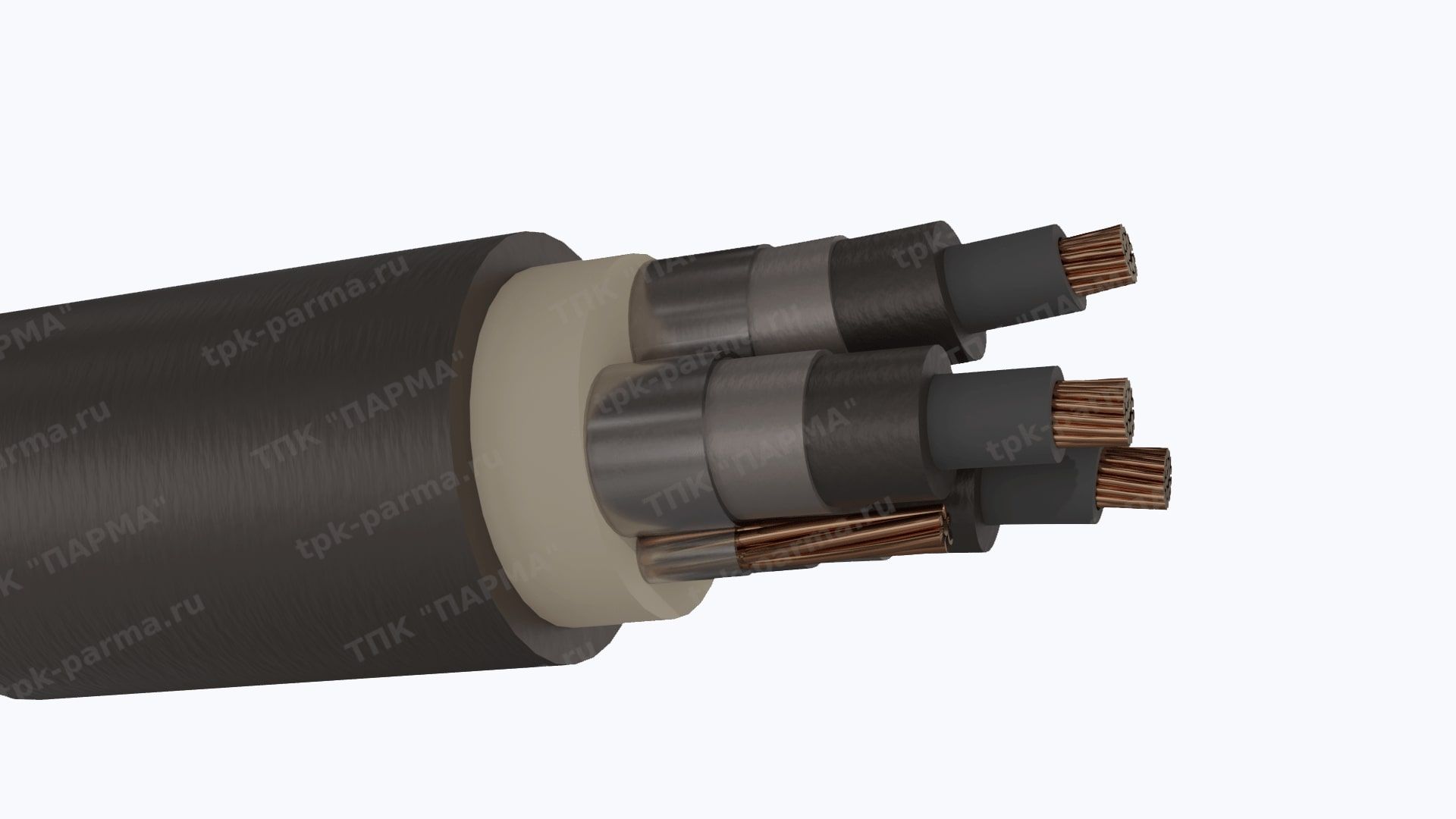 1. Три многопроволочные медные круглые основные жилы с площадью номинального поперечного сечения 50 мм2, соответствующие 5 классу по ГОСТ 22483-2012.